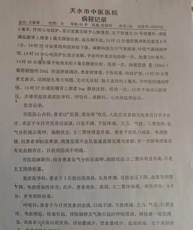 《極目新聞》報道,石先生敘述,母親12月1日在天水市中醫醫院肛腸科就診,12月2日因痔瘡問題在該醫院接受手術,術後初期無異常,一直住院觀察,「本來是覺得痔瘡手術是風險比較低的小手術,而且20年前我媽也在這家醫院做過同樣的手術,當時覺得還可以,再加上離家近,就選擇了這裏」。